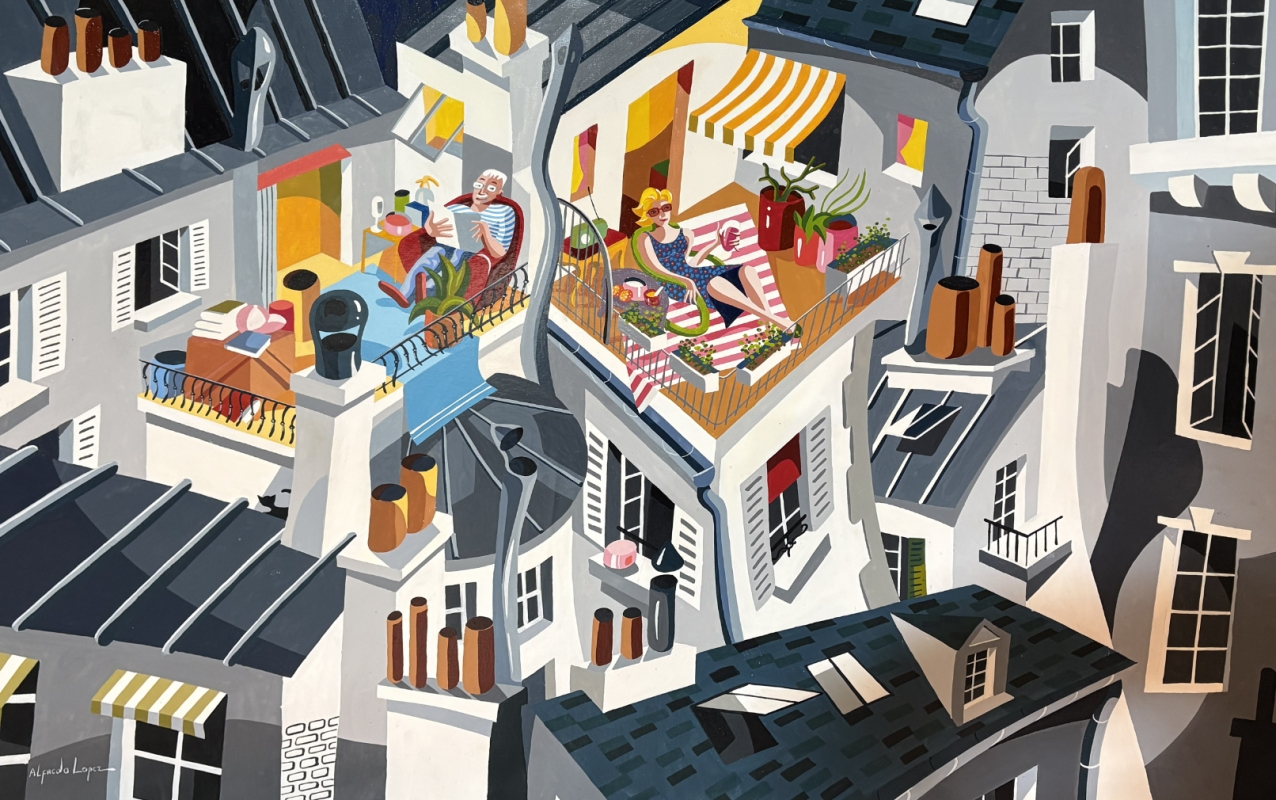 Roméo et Juliette12/12/2025 Une romance improbable, une comédie douce-amère entre deux âmes solitaires perchées Acrylique et Glycéro, Toile, 80x80cm Disponible à la galerie de Paris rue st Louis en l Île 75004